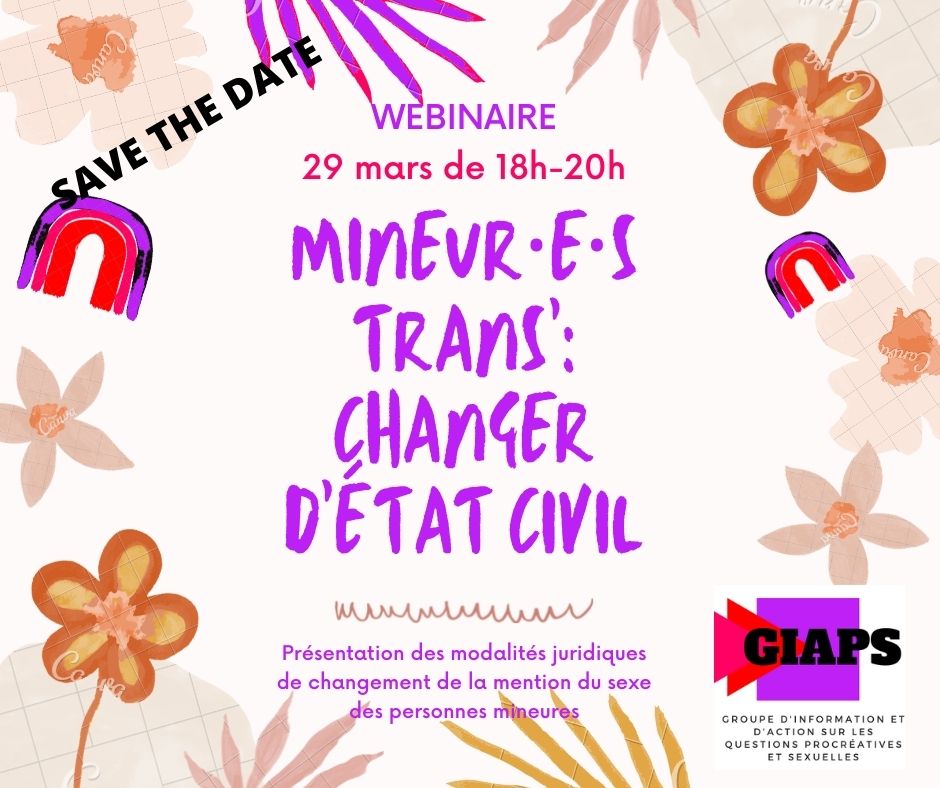 Le 29 mars, de 18h à 20h, le GIAPS vous propose un webinaire pour vous (in)former sur les procédures juridiques de modification des prénoms et de mention du sexe pour les personnes trans’ mineures.