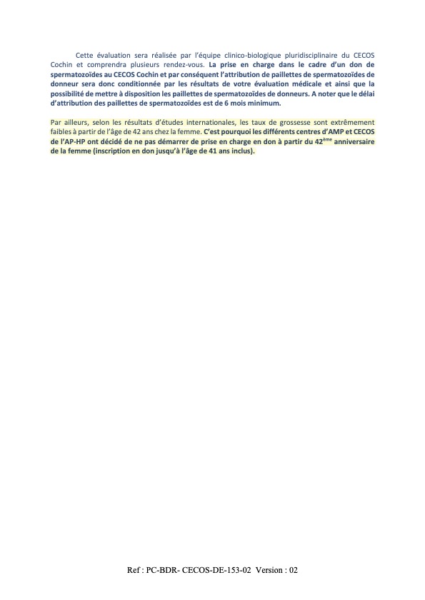 « par ailleurs, selon les résultats d’études internationales, les taux de grossesse sont extrêmement faibles à partir de l’âge de 42 ans chez la femme. C’est pourquoi les différents centres d’AMP et CECOS de l’AP-HP ont décidé de ne pas démarrer de prise en charge en don à partir du 42ème anniversaire de la femme (inscription en don jusqu’à l’âge de 41 ans inclus) ».